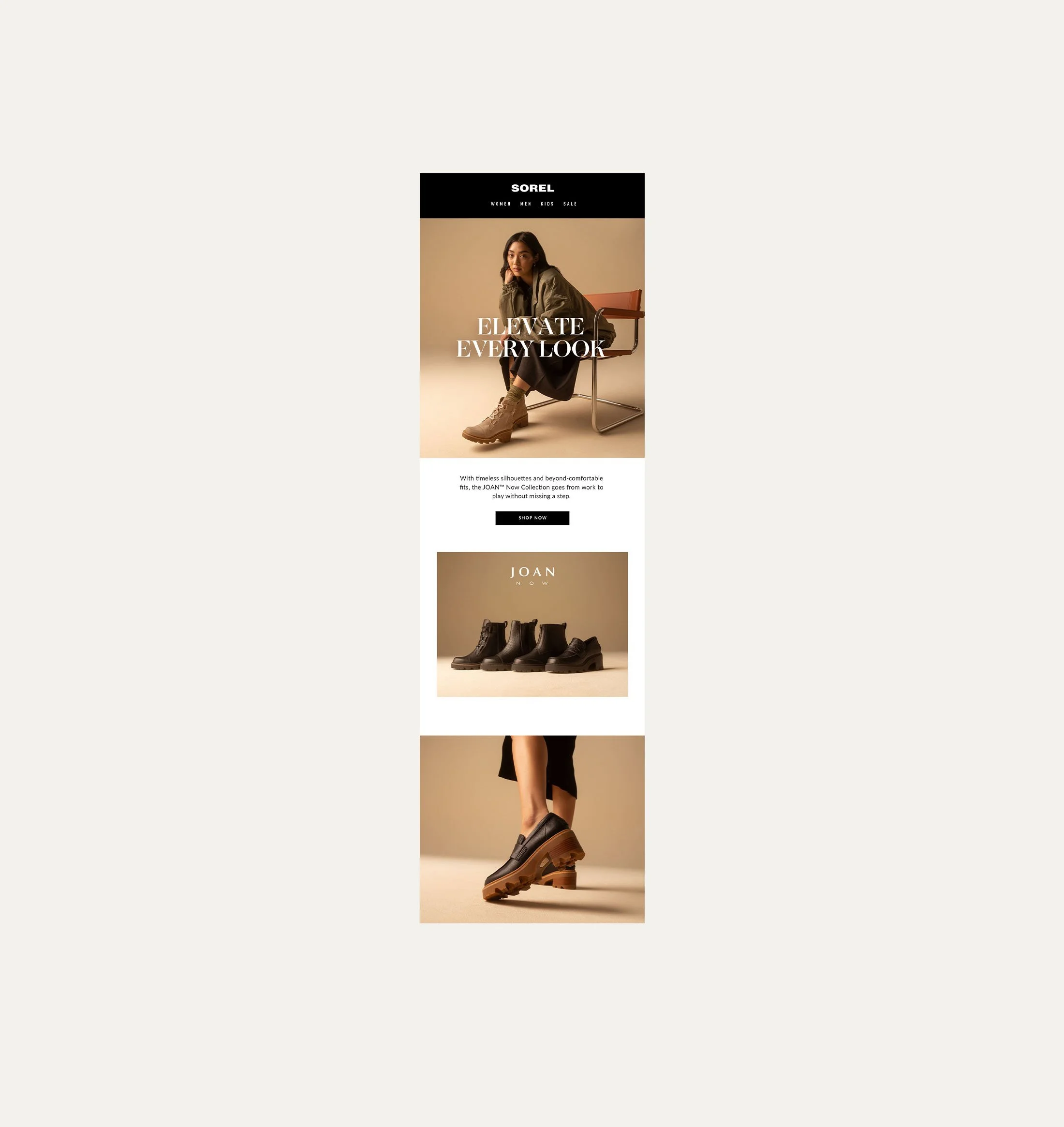 This collection was highly successful in driving sales in early fall, most of that credited to the photography. This creative lived on the homepage for SOREL.com through September and October 2024, as well as across email and social.